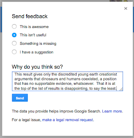 This has sparked an outcry from the science community and several people have posted about it. Of course, the search results have changed in the intervening time. Now when you do the search, you get hits from people asking why Google is giving out this kind of information. This hit the airwaves at least sixteen hours ago and Google has yet to adjust its search results, however. The top result, after the “in the news” story, is still the one from Ken Ham's organization. Greg Laden suggests that people tell Google that their results are unreliable by using the "Feedback" button next to Ken Ham's book plug. I will be curious to see what this looks like a day from now. He writes: